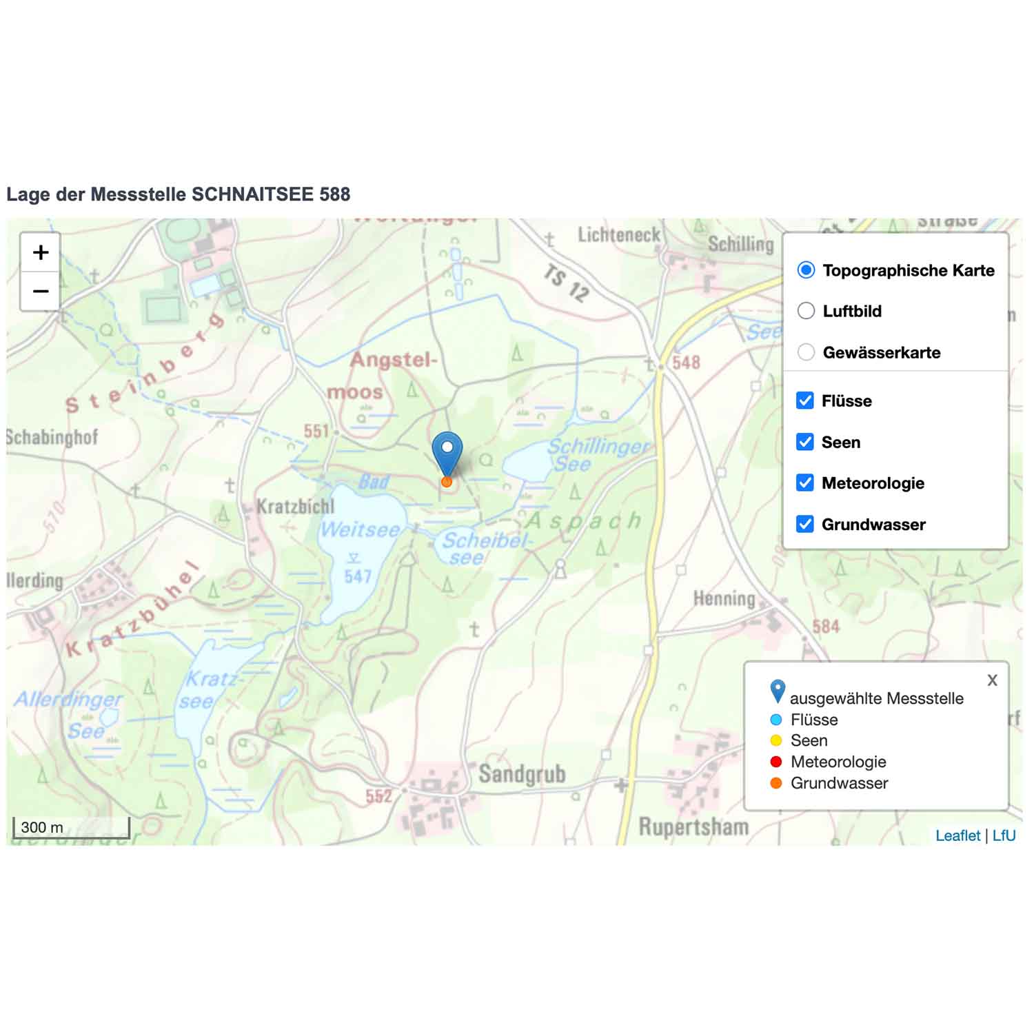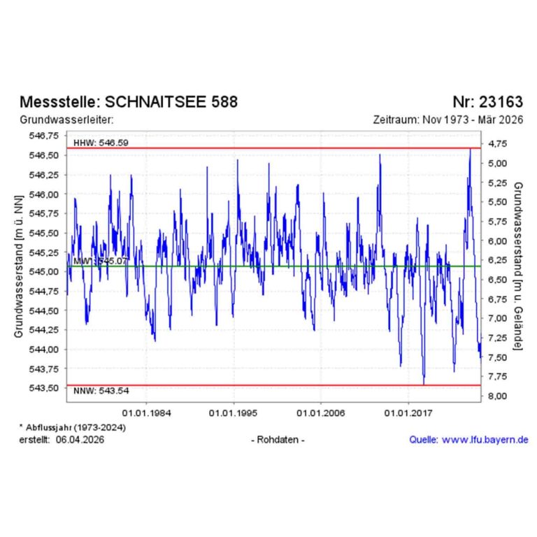 Die Messstelle Schnaitsee 588 weist über die Jahrzehnte zwar natürliche Schwankungen auf, in den letzten Jahren liegt das Niveau aber häufiger unter dem langjährigen Mittel. Das spricht dafür, dass die Grundwassersituation zunehmend unter Druck steht. mehr...